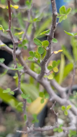 它是一種低矮、不常見的沒藥屬植物,外觀上有銀灰至棕綠色的樹皮和可愛的三片小圓葉。